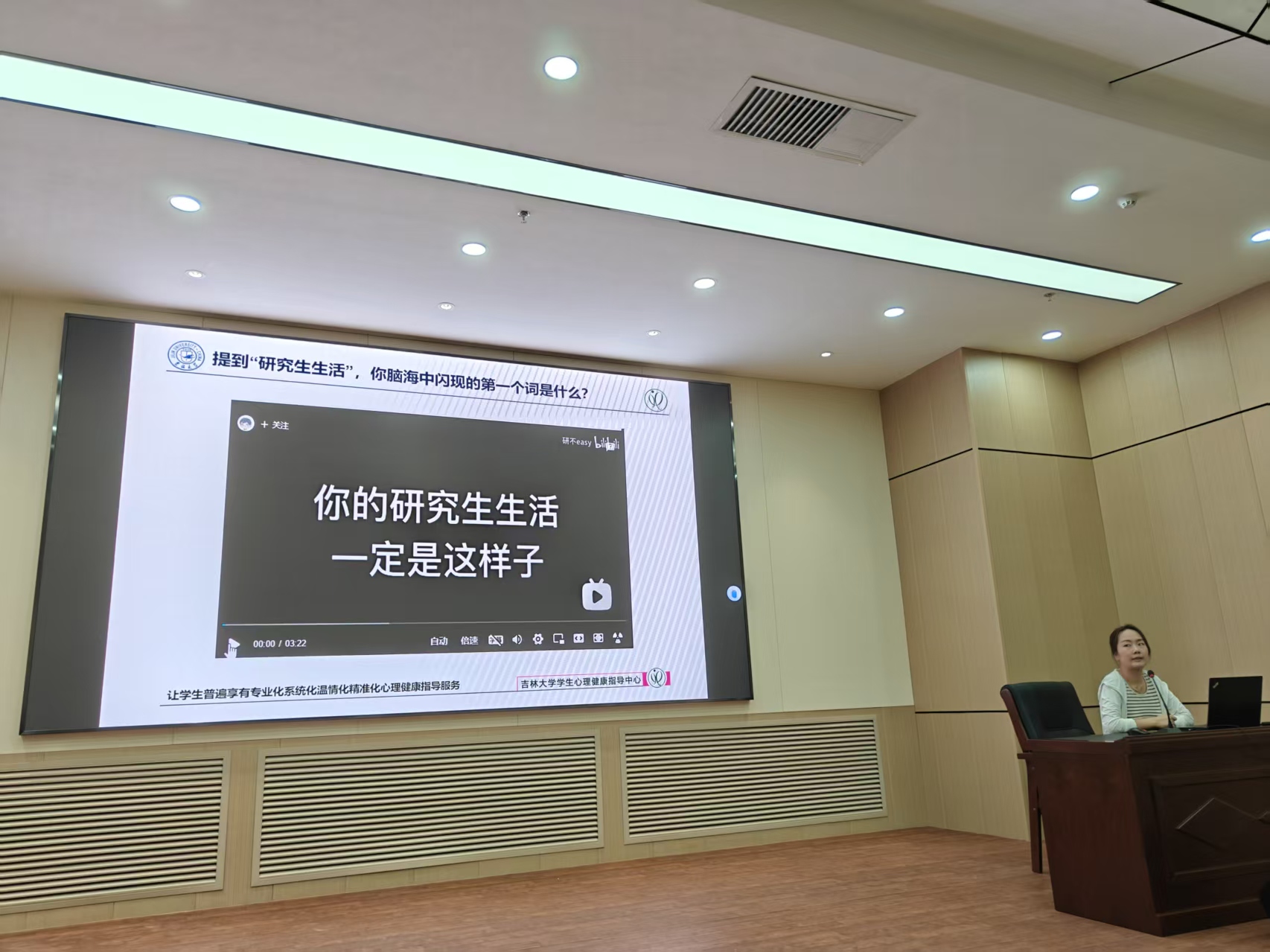 讲座伊始,李娜老师播放了一段轻松幽默的短片,用同学们喜闻乐见的方式展现研究生日常心路历程,现场气氛很快活跃起来。结合短片内容,李娜老师指出研究生常见的学习压力、就业焦虑、经济困扰、师生关系及恋爱婚姻等问题,并通过专业解析,引导同学们理性看待这些现象,找到适合自己的解决办法,同时学会挖掘自身潜力、寻求外部支持。