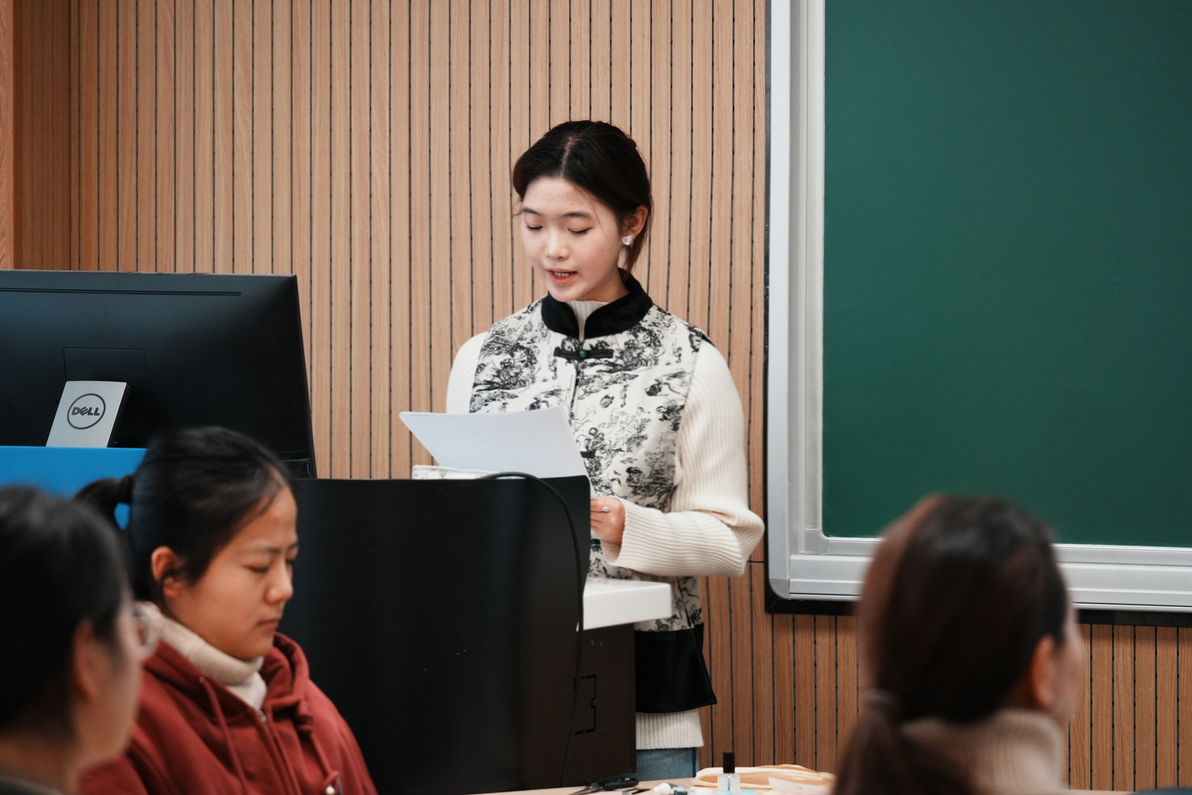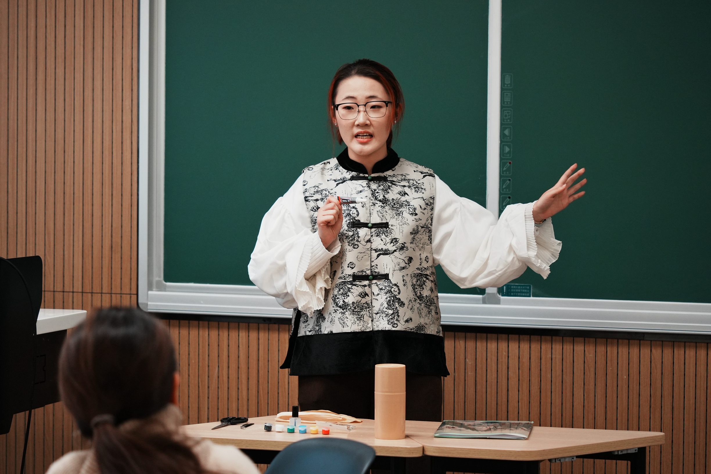 闫志璇带领同学们走进点翠工艺的世界。她以环保、便捷的方式转化传统工序,细致拆解材料准备、翠羽上色、裁剪修理、贴翠封层四个核心步骤,逐一强调注意事项,让同学们在清晰指引中,体悟传统技艺的精妙。