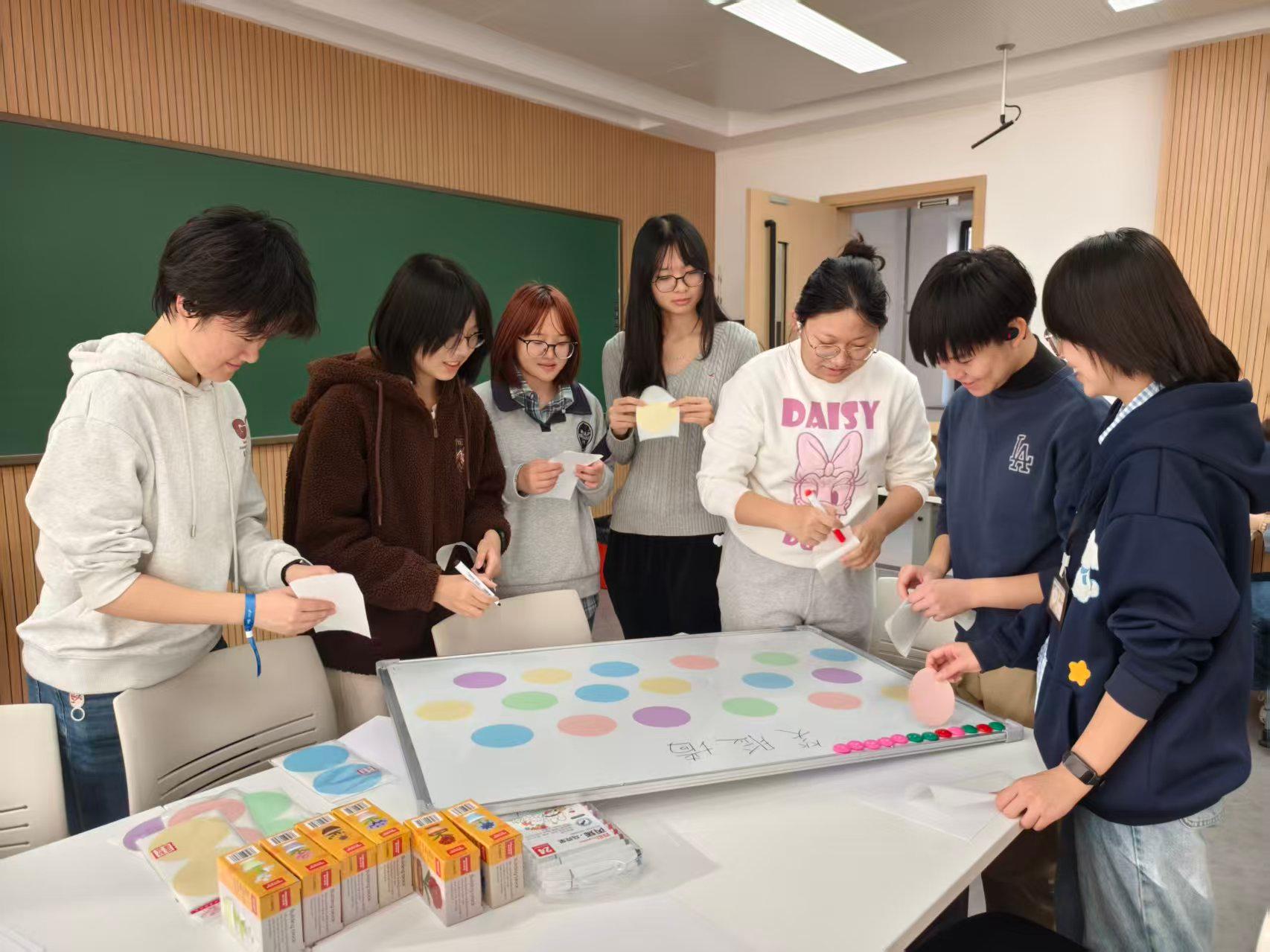 在“心灵涂鸦”环节,同学们拿起画笔,以色彩和线条为载体,将内心对焦虑的感知、处理压力的想法尽情描绘在画纸上,原本无形的情绪在笔尖转化为生动的作品,起到了良好的情绪疏导作用。